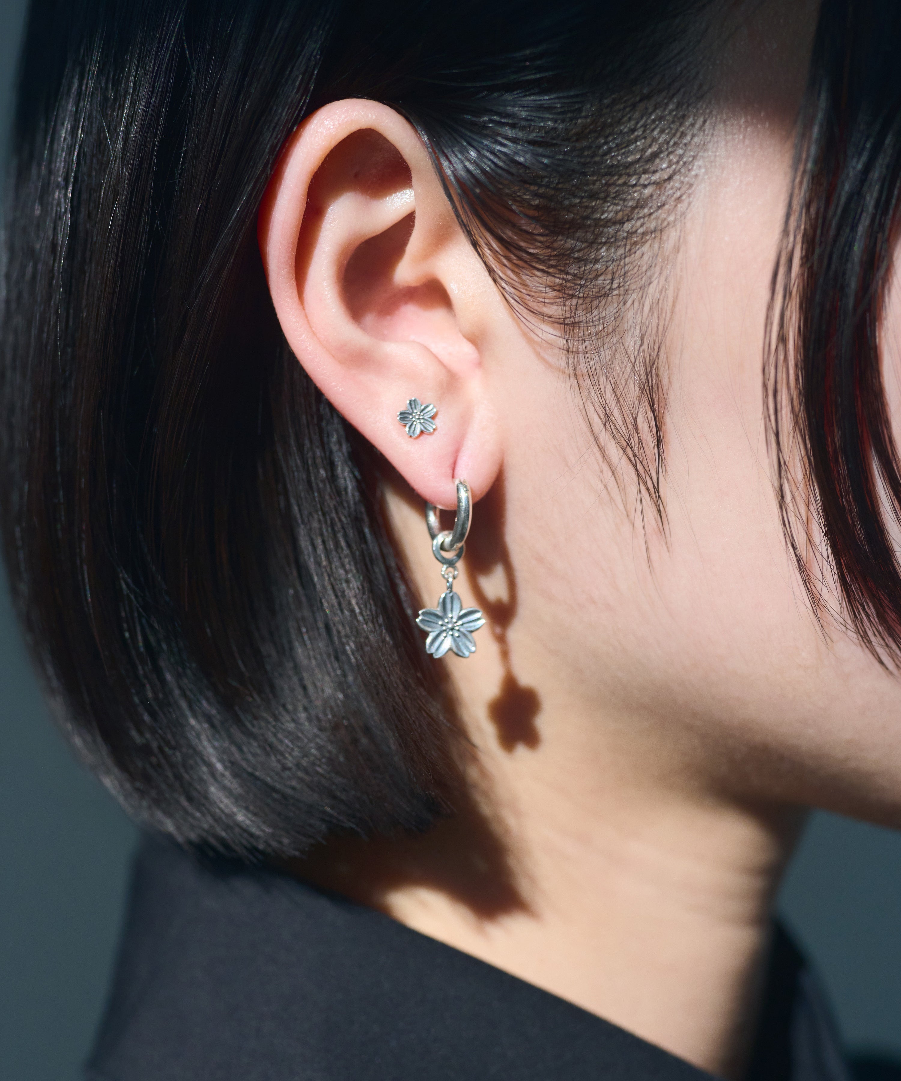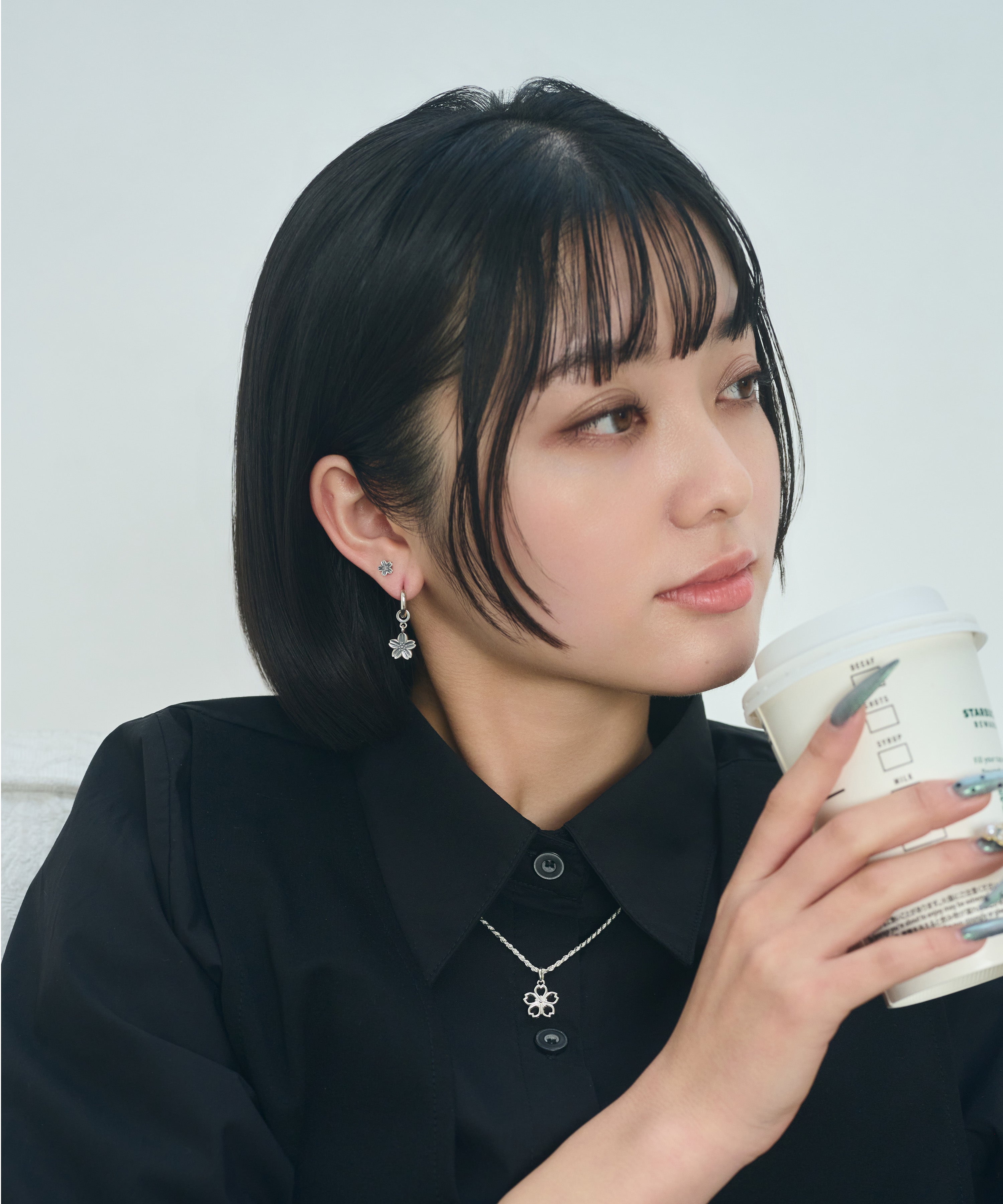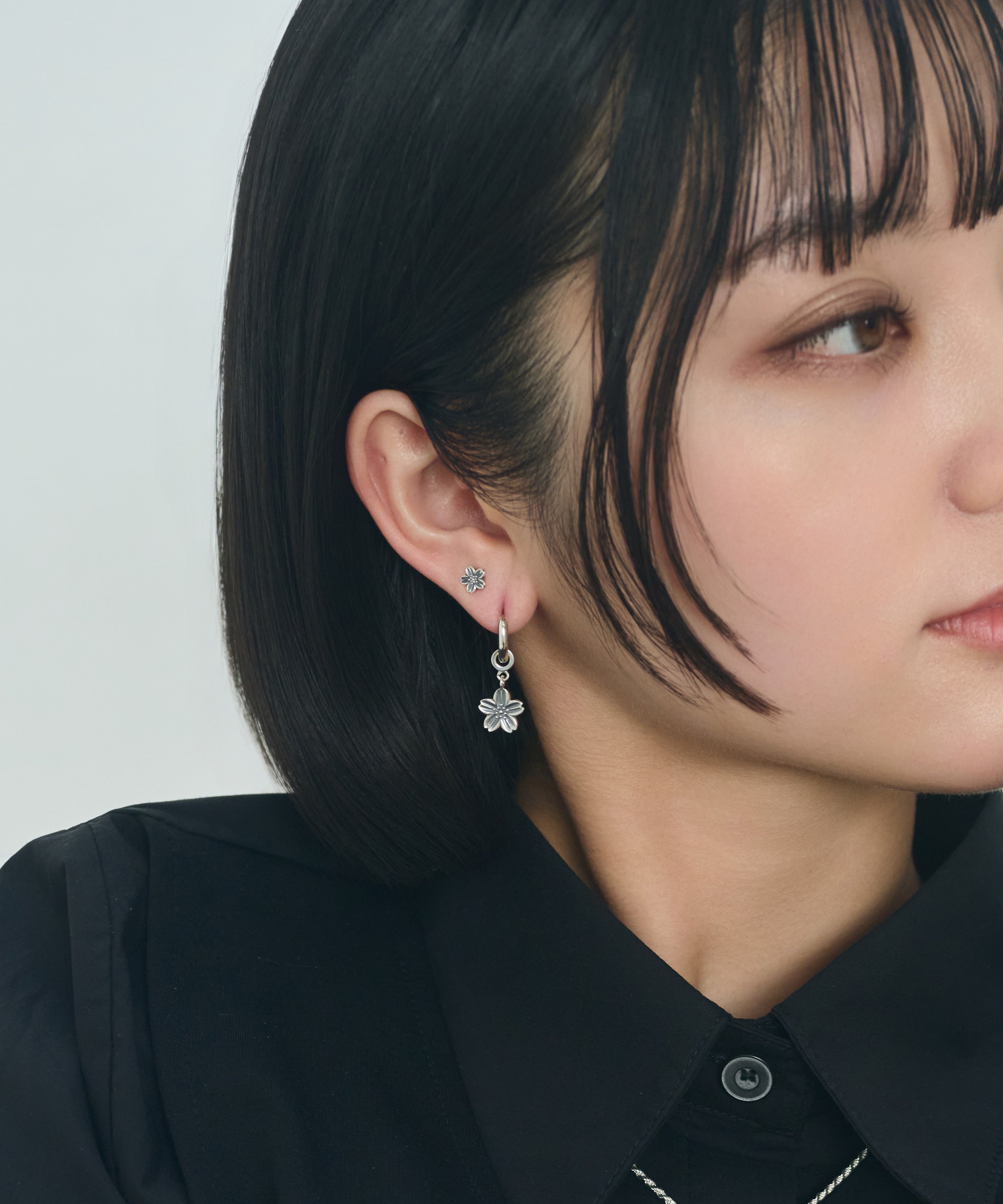 甘さを抑えたダークなニュアンスの黒桜が耳元で揺れることで、